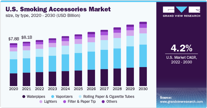 The global smoking accessories market size was valued at USD 64.4 billion in 2021 and is anticipated to expand at a compound annual growth rate (CAGR) of 4.0% from 2022 to 2030. The growth of the market is attributed to the increasing number of smokers around the world coupled with the rising trend of launching new and innovative products to intrigue more users. Moreover, the rising preference of consumers to make their own tobacco over products that are factory-made as they can be customized as per their needs along with saving money is a key factor that is anticipated to drive the market in the coming years.